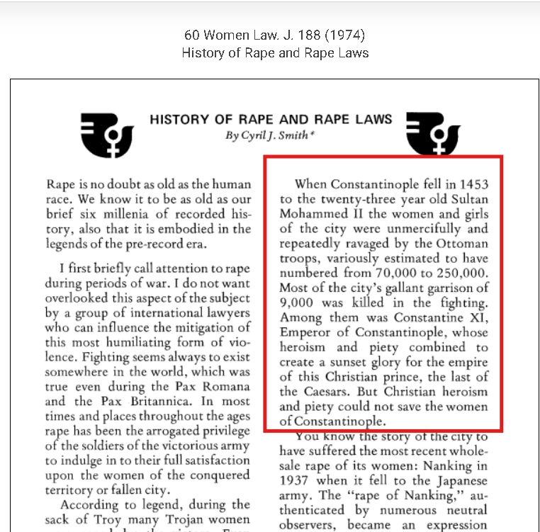 Cyrill J. Smith’in “Tecavüzün ve Tecavüz kanunlarının tarihi” adlı çalışmada, İstanbulun Mehmet II tarafından alınmasından sonra 70.000 – 250.000 arası kadının tecavüze maruz kaldığı tahmin edilmekte.